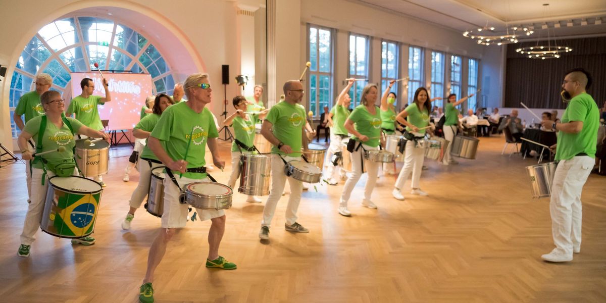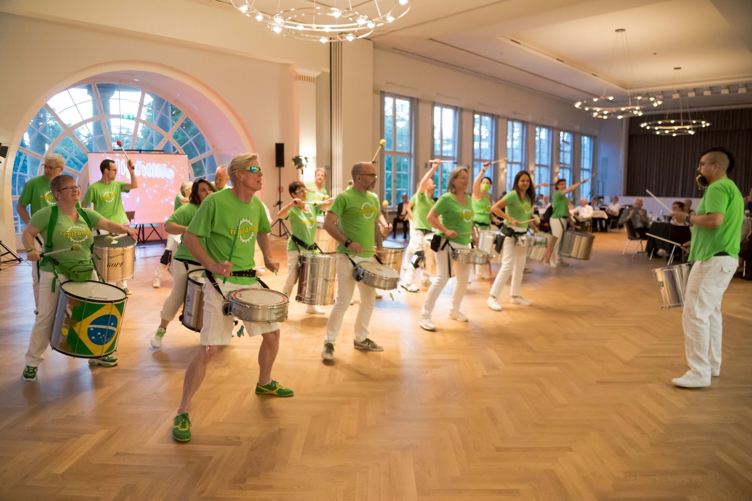 Mit launigen Gedichten und Texten zum Thema Trommel führte Karl-Heinz Gies als Moderator durch das vielseitige Programm des Abends. Schon vor Beginn trommelte die große Trommlergruppe Repicando die Ballteilnehmer im Brunnenhof zusammen. Bei einer weiteren Einlage im Saal wurden die Gehörgänge der Ballbesucher frei getrommelt.