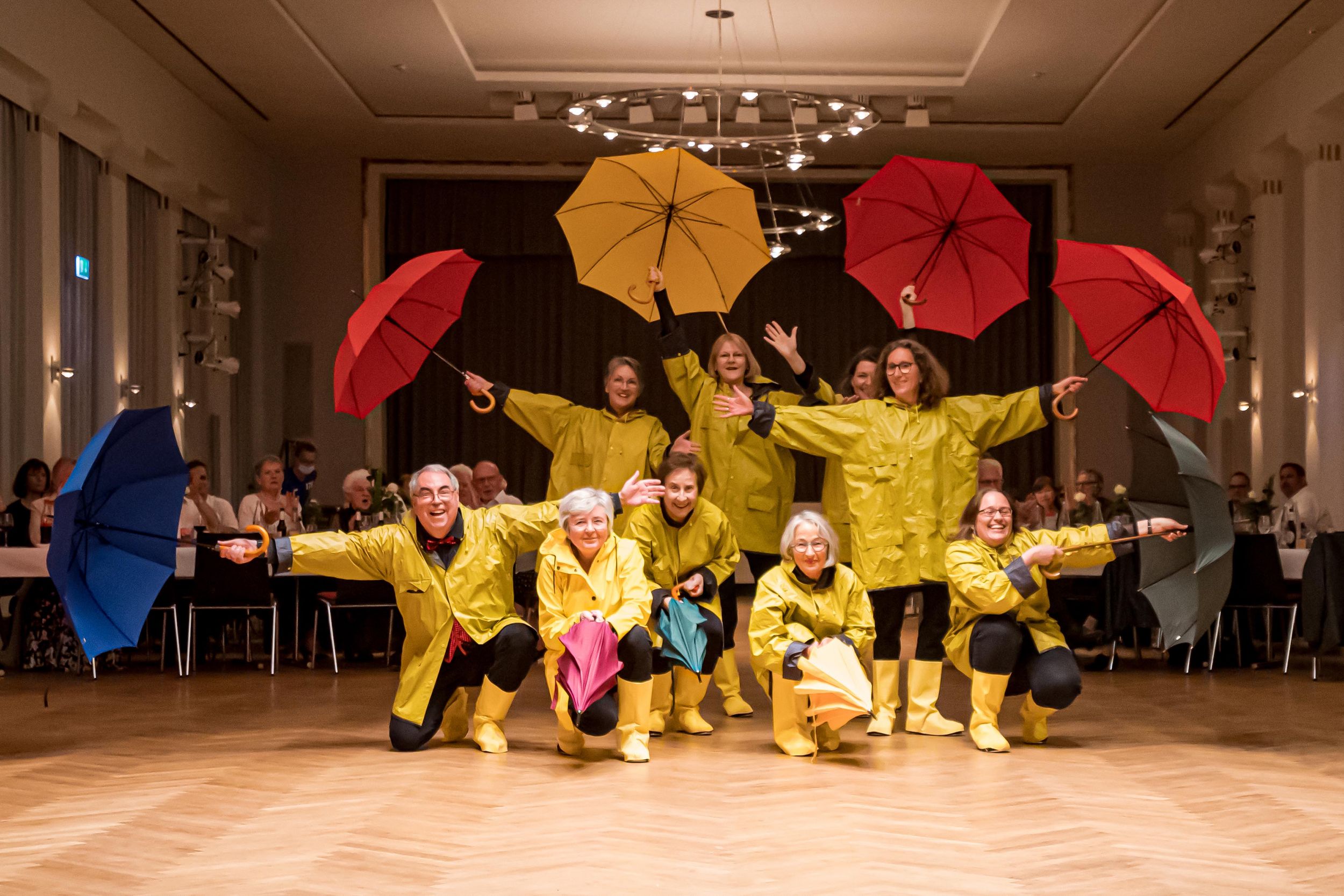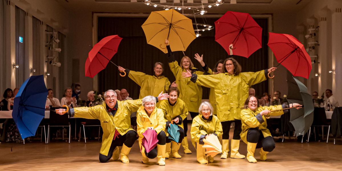 Virtuelle Regentropfen trommelten auf die Stepptänzer „Stäffelesstepper“ mit Ihren Schirmen und Regenjacken ein. Zu „Singing in the rain“ wurde ein schwungvoller Stepptanz präsentiert und mit einer weiteren Steppeinlage zur Musik „Lollipopp“ gekrönt. Langanhaltender Applaus war den Stepptänzern sicher.