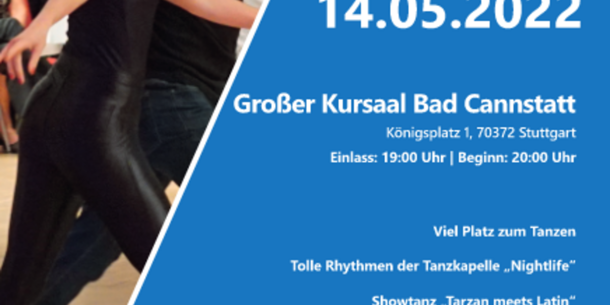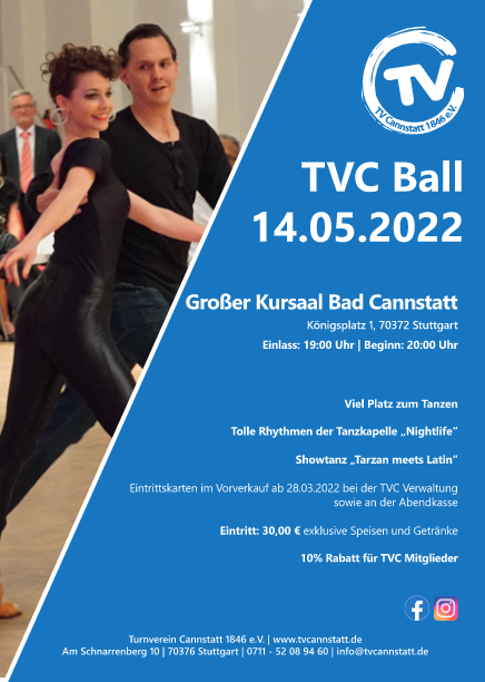 Am Samstag den 14.05.2022 findet im großen Kursaal in Bad Cannstatt der TVC Ball statt. Einlass ist um 19:00 Uhr und los geht es um 20:00 Uhr. Nach zwei Jahren Corona Pause geht es nun mit viel Platz zum Tanzen auf dem Parkett wieder zur sache. Tolle Rythmen der Tanzkapelle "Nightlife" führen durch den Abend. Es erwartet Dich ein Showtanz mit dem Titel: "Tarzan meets Latin".