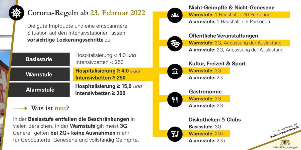 Mit Beschluss vom 22. Februar 2022 hat die Landesregierung die Verordnung über infektionsschützende Maßnahmen gegen die Ausbreitung des Coronavirus (Corona-Verordnung) erneut geändert. Die Änderungen treten am 23. Februar 2022 in Kraft. Damit gilt in Baden-Württemberg ab HEUTE 23. Februar 2022 wieder die Warnstufe und die 3G-Regelung im Sport. Weiterführend ist weiterhin keine Datenerhebung notwendig.