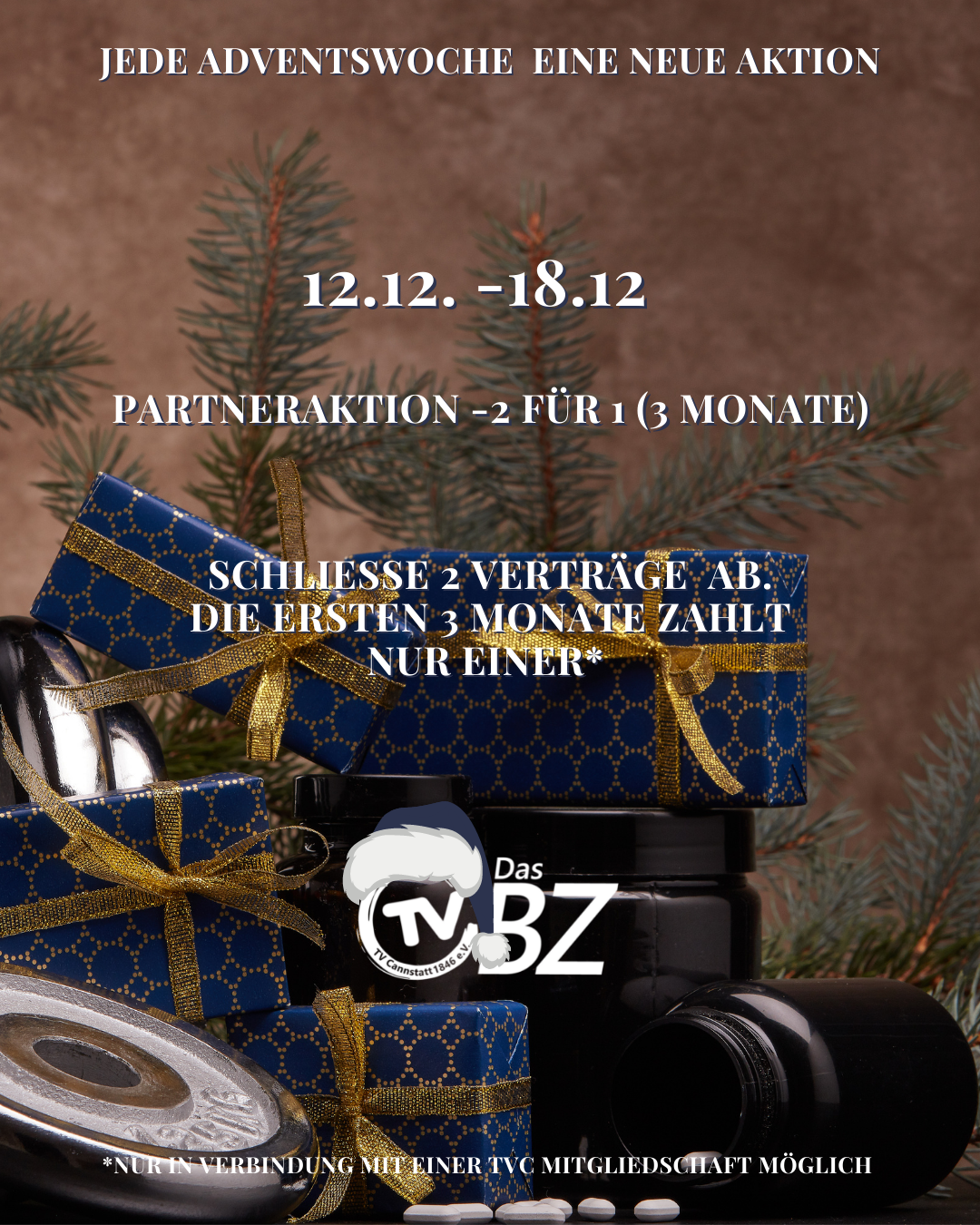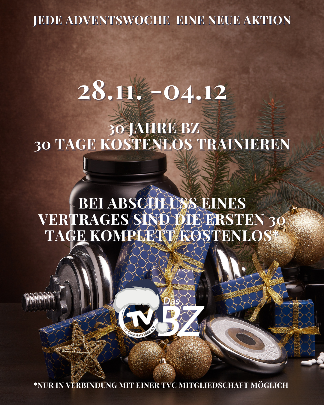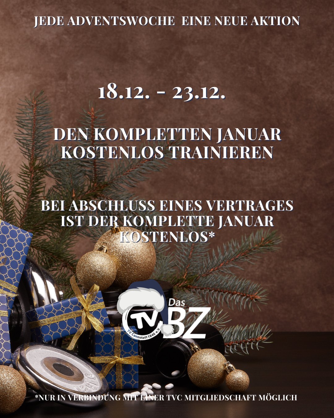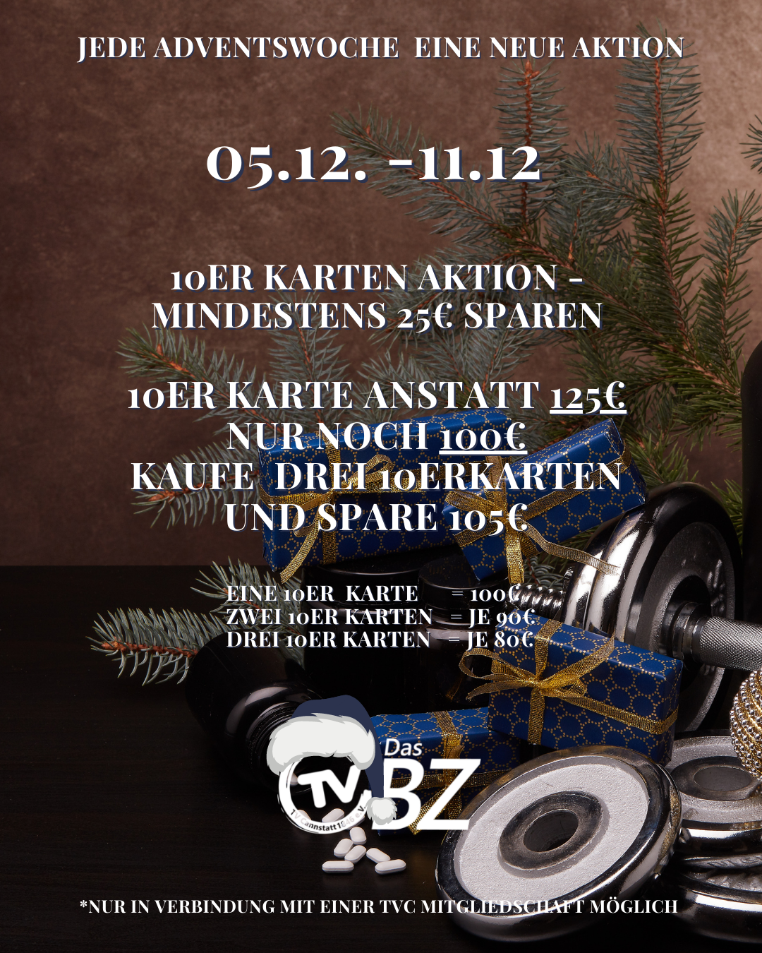 Das Vereinseigene Fitnessstudio des TV Cannstatt (das Bewegungszentrum), präsentiert sich im Advent mit vier verschiedenen Aktionen. Dabei können Sie kräftig sparen und mit Ihrer Fitness voll durchstarten. Egal ob Sie mit 10er Karten trainieren wollen und die Flexibilität für sich in anspruch nehmen oder ob Sie mit Ihrem Partner, Ihrer Partnerin kommen und er/sie die ersten 3 Monate kostenlos Trainieren kann. Für jeden Fitness-Wiedereinsteiger, ist etwas dabei!