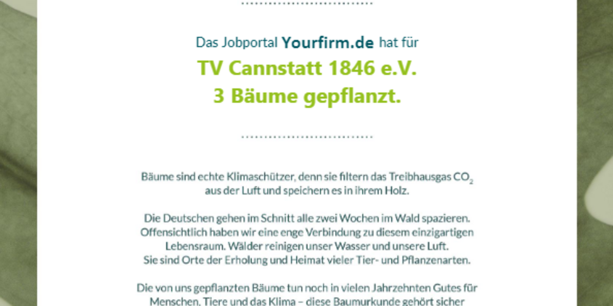 Wie Ihr bereits wisst, sucht der TV Cannstatt Personal. Dabei setzen wir auf Stellenanzeigen über das Portal von Youfirm.de und konnten dadurch bereits 3 Bäume fürs Klima pflanzen. Nähere Informationen wo die Bäume gepflanzt wurden, findet ihr hier: (Quelle: https://www.yourfirm.de/nachhaltigkeit/stellenanzeige-pflanzt-baum/)